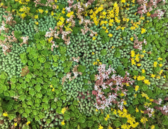 De sedummixmat is circa 3 cm dik en is voor begroeid met tien tot twaalf verschillende soorten sedumplantjes. Deze plantjes groeien op een kokosvezelmat en een speciaal ontwikkelde substraatmat. Onze sedummixmat is bij levering altijd minimaal voor 95% begroeid.