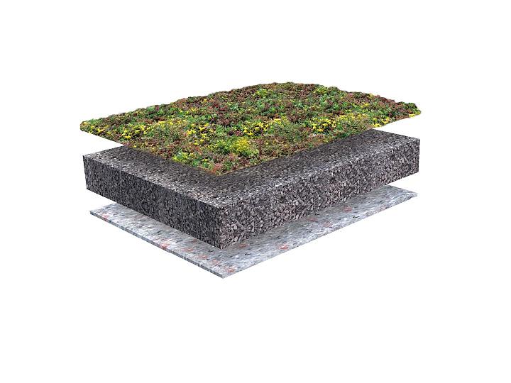 - De substraatlaag is 50 millimeter dik. Het extensieve daktuinsubstraat bestaat uit lava, bims en compost en is een uitstekend hulpmiddel voor de sedumplantjes om goed te groeien.