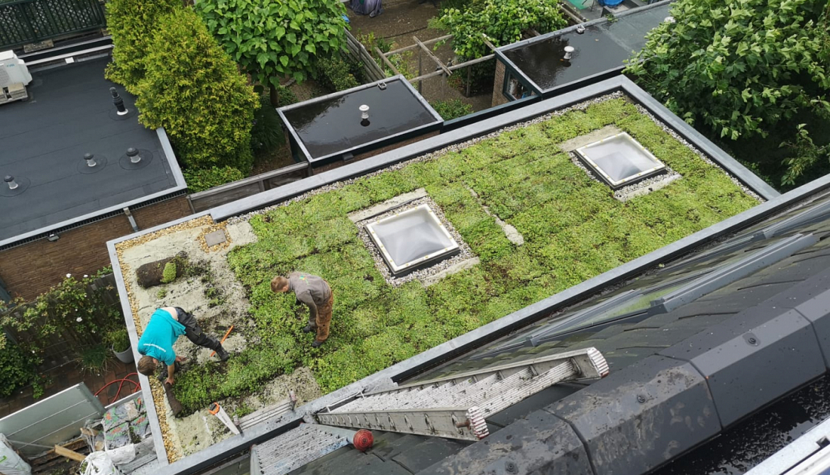 Groendak aangelegd in Haarlem met zonnepanelen. Wist je dat zonnepanelen meer rendement leveren in combinatie met een groendak? Het dak wordt in de zomer veel minder warm (ongeveer 30 graden t.o.v. 80 graden). Een zonnepaneel haalt namelijk maximaal rendement bij ongeveer 25-30 graden!